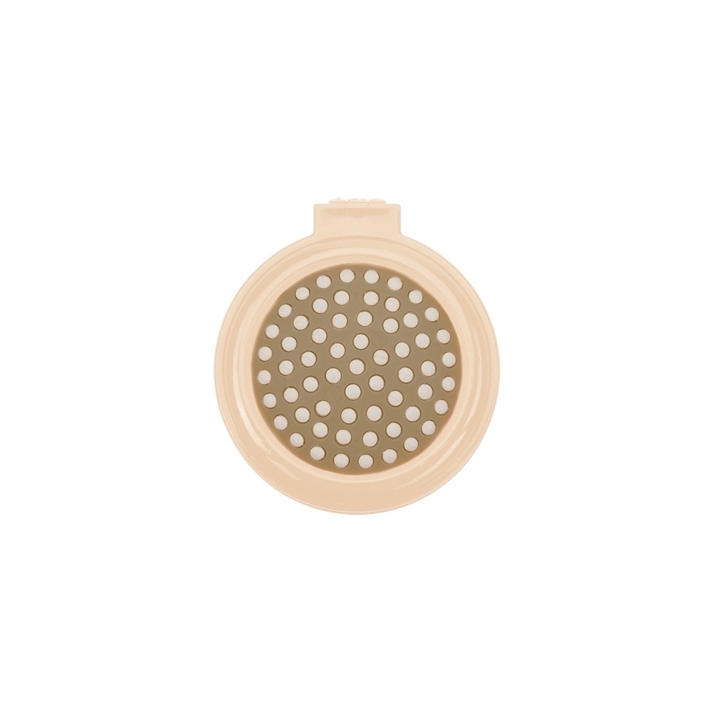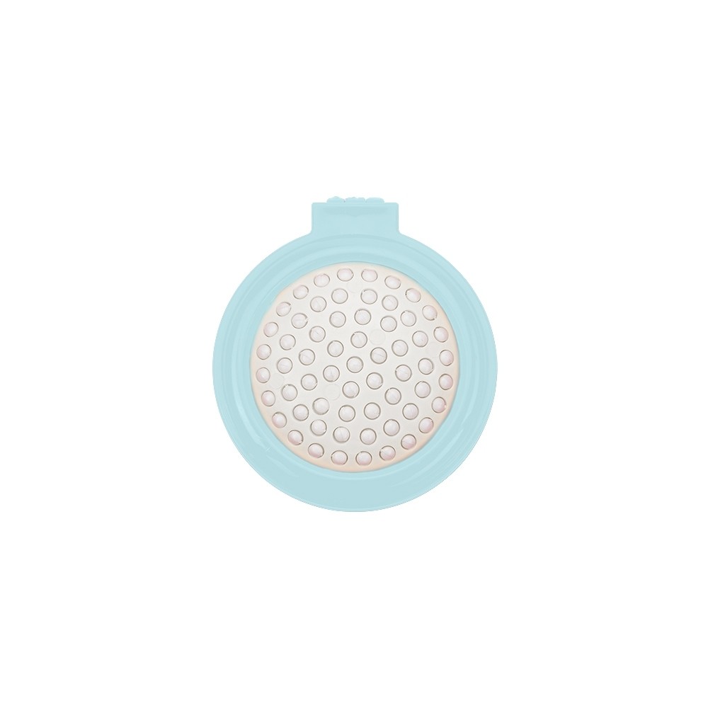 Escova com espelho redonda em plástico resistente. Parte superior plana e parte inferior emborracha com relevo, estando aberta a peça basta empurrar a parte emborrachada(lado de fora) para poder utilizar a escova.